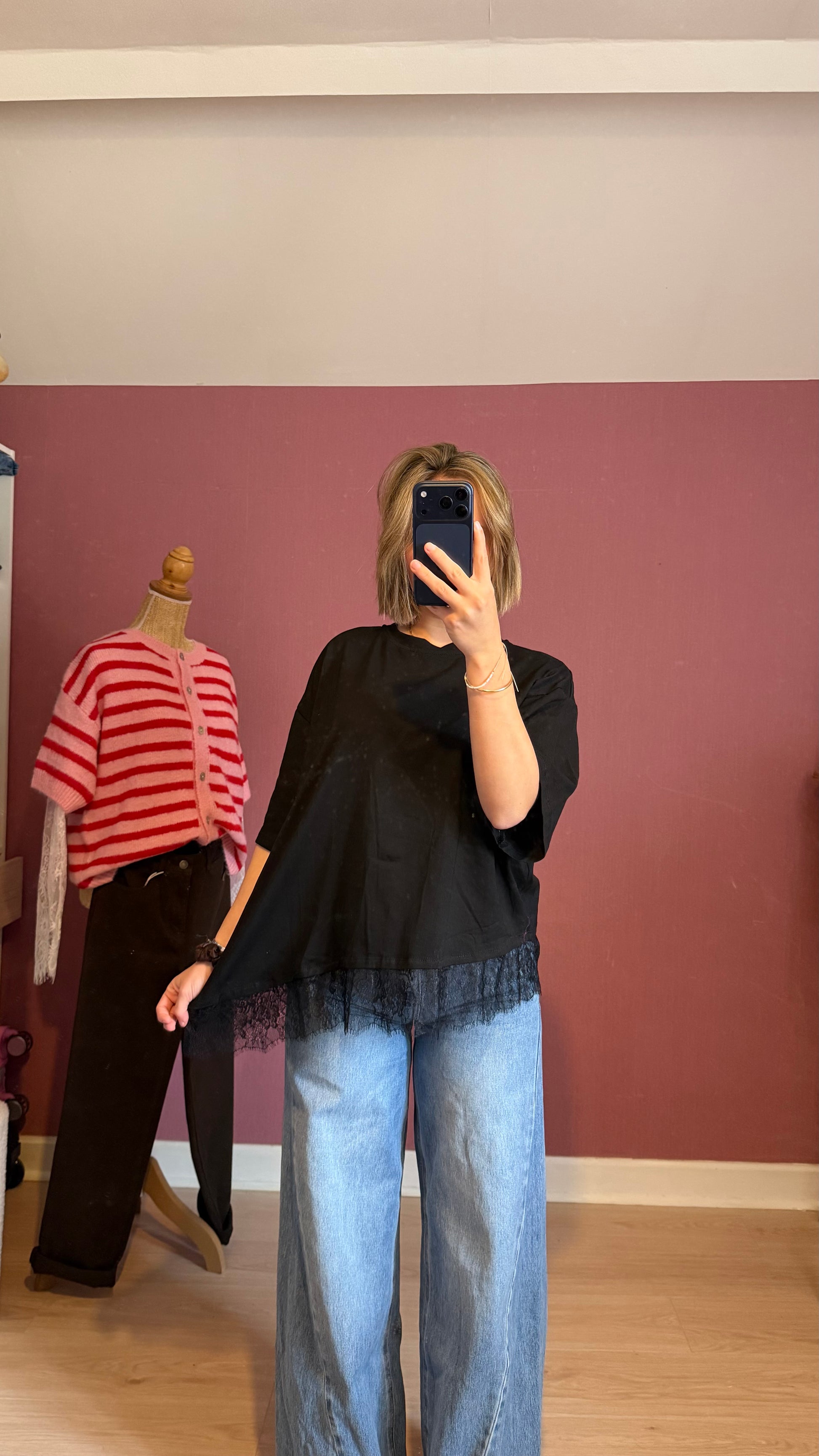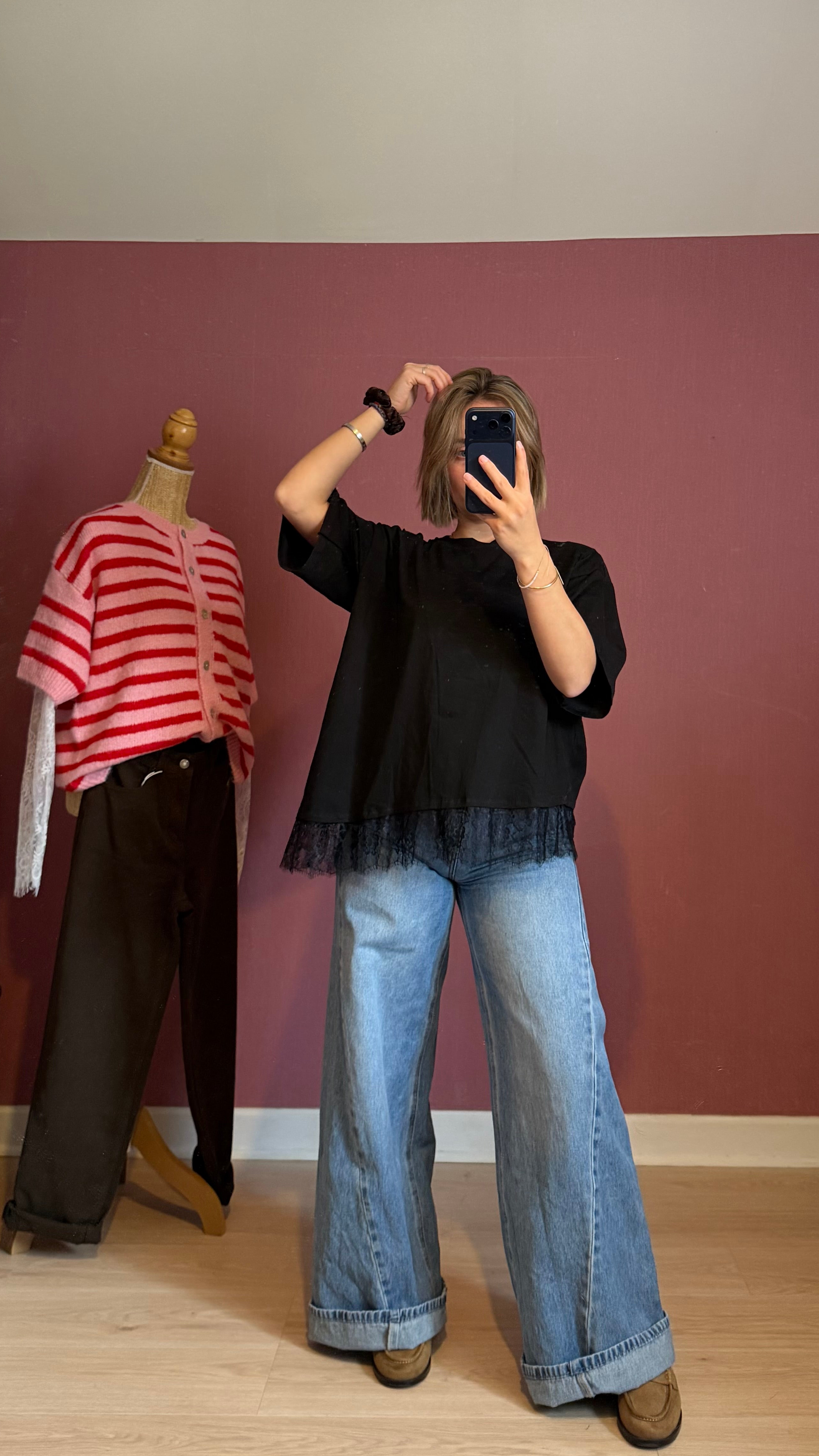 Découvrez notre tee-shirt noir revisité, une pièce élégante avec un détail raffiné. Son bas en dentelle asymétrique apporte une touche féminine et délicate tout en restant facile à porter au quotidien. Confortable grâce à sa matière légèrement stretch, il s’adapte parfaitement à la silhouette. Un basique revisité, idéal à associer avec un jean ou un pantalon plus habillé pour un look chic et moderne 🤍