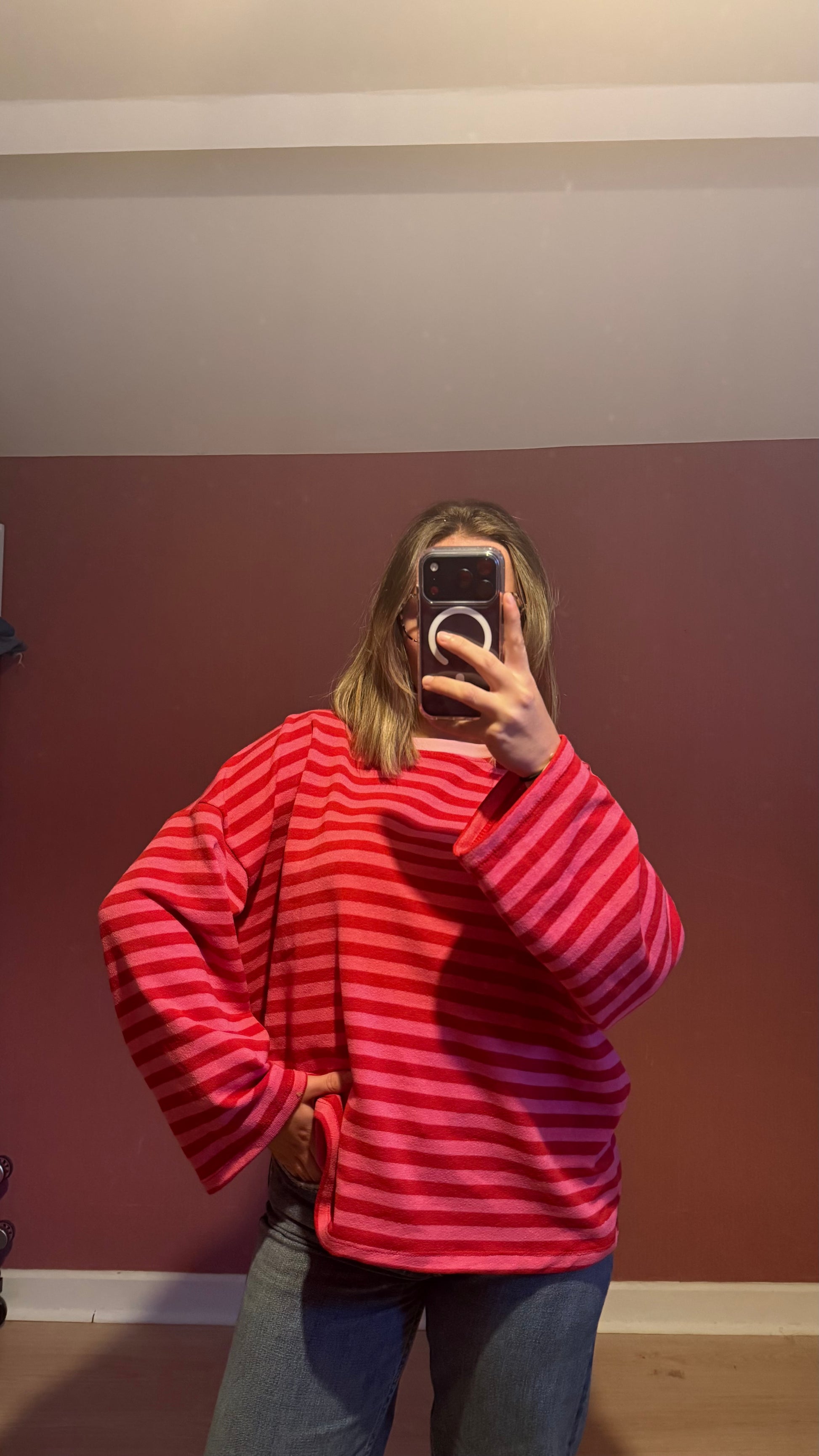 Avec ses rayures rose et rouge, il offre un style à la fois tendance et féminin, tout en restant confortable et facile à porter. Sa matière douce et agréable en fait un indispensable de la saison — à porter aussi bien seul que sous un gilet ou une veste.