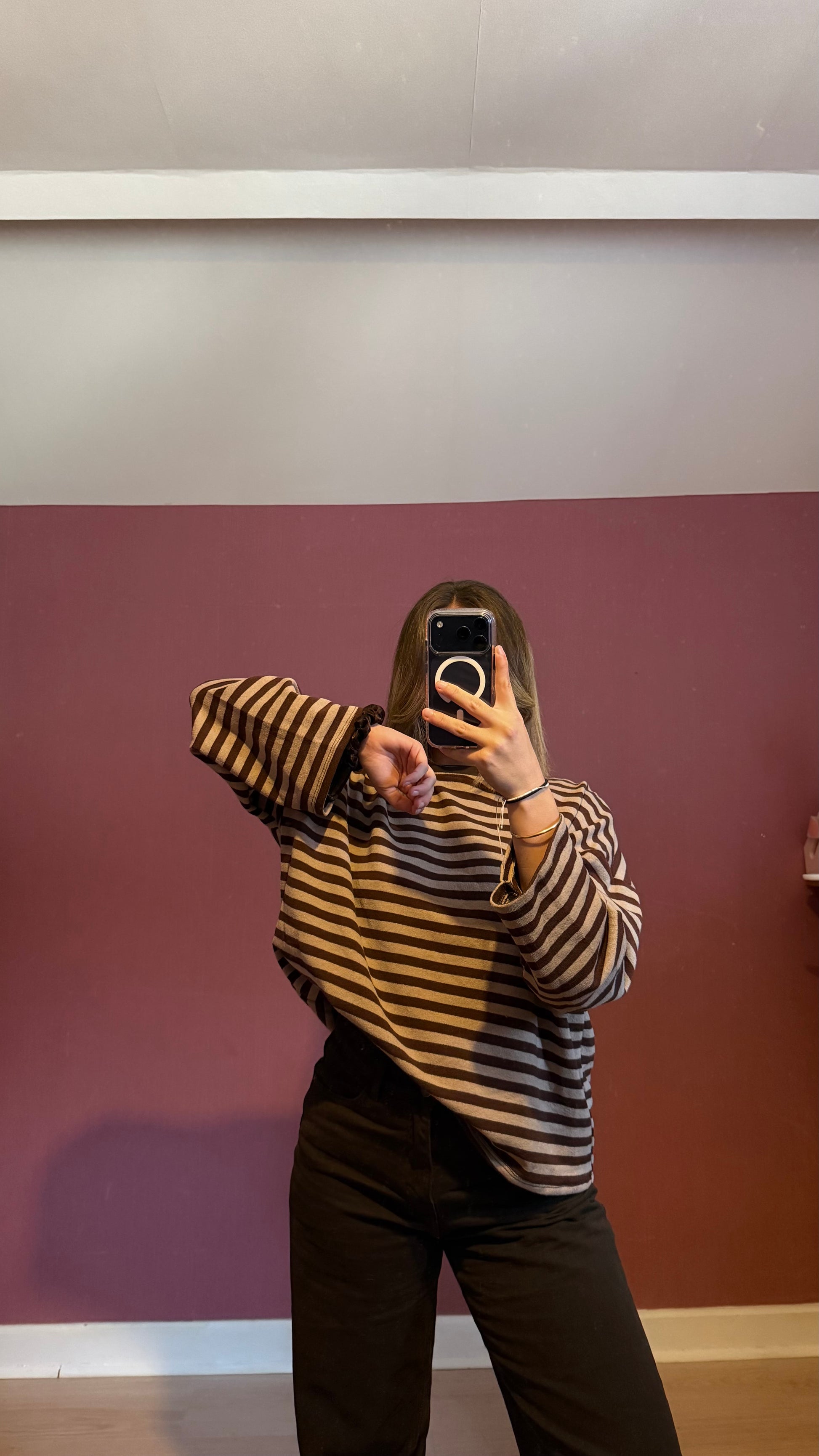 Avec ses rayures marron et beige , il offre un style à la fois tendance et féminin, tout en restant confortable et facile à porter. Sa matière douce et agréable en fait un indispensable de la saison — à porter aussi bien seul que sous un gilet ou une veste.